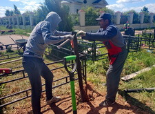 На каждом из четырёх углов вкручиваем сваи. Грунт на данной могиле попался твёрдый, после того, как сваи уже не вкручиваются, начинаем их забивать. Окончательно загнать сваи в землю так и не удалось, поэтому срезаем выступающие части. На качестве каркаса данное решение никак не отобразилось, так как длинна наших свай всегда несколько больше, чем требуется.