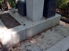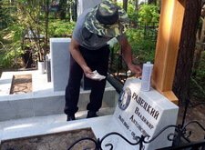 Так выглядело место захоронения на момент окончания работы: деревянный крест покрыт защитным раствором; мраморные изделия отшлифованы и покрыты гидрофобной субстанцией, стыки элементов промазаны белым герметиком; полые столбики, восстановлены; в цветнике заменена земля и посажен газон.